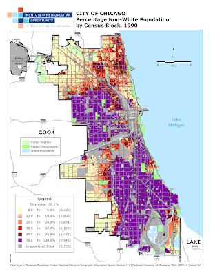 Which brings us to Minneapolis segregation. Predominantly nonwhite communities form two distinct "blobs" on the map that grow and change over time. The dynamics of segregation -- both the inability of nonwhite residents to find housing outside of racially concentrated areas, and the tendency of white residents to flee from an area as it racially transitions -- ensures these "blobs" remain coherent and well-defined on the map, even as the city's nonwhite population grows rapidly. It's easy to trace the advance of segregation through neighborhoods and along major transit corridors, and though the map is restricted to Minneapolis, easy to imagine how this process drives waves out-migration to the suburbs, causing sprawl and stratification.